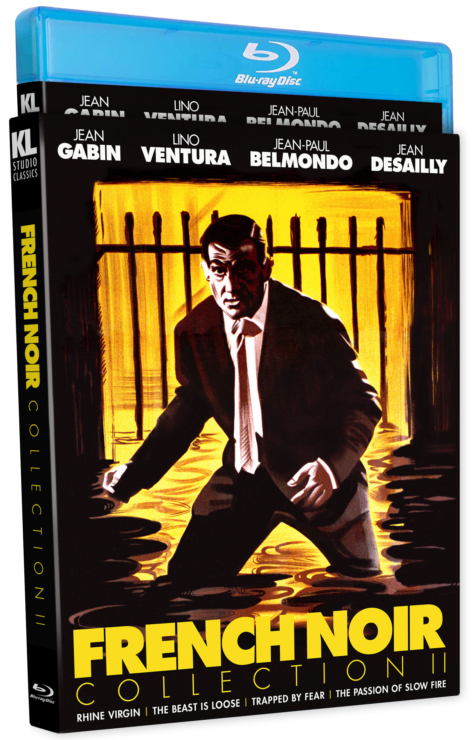 This collection features four film noir classics from France. Rhine Virgin (1953) a.k.a. La vierge du Rhin – Screen great Jean Gabin (Port of Shadows) stars as Jacques Ledru, assumed killed during the war, who returns to Strasbourg to find that his wife Geneviève (Elina Labourdette, Les Dames du Bois de Boulogne) has taken control of his shipping company with her new husband (Renaud Mary, Fantômas). Femme fatale Geneviève will do anything to get rid of Jacques and keep his company. Directed by Gilles Grangier (Hi-Jack Highway, Speaking of Murder). The Beast Is Loose (1959) a.k.a. Le fauve est lâché / The Tiger Attacks – The distinguished Lino Ventura (Illustrious Corpses) portrays Paul Lamiani, an ex-gangster who has become a hero of the Resistance. He has now settled down for a quiet life with his family in the restaurant business. But the French Secret Service need him for one more mission, and when he refuses, they frame him and set up his escape from the police. Directed by Maurice Labro (To Catch a Spy) and featuring Estella Blain (The Diabolical Dr. Z) as a two-timing blonde. Trapped by Fear (1960) a.k.a. Les distractions – Film idol Jean-Paul Belmondo (Breathless, Cop or Hood) stars as Paul Frapier, a reporter and photographer who comes to the rescue of Laurent (Claude Brasseur, Band of Outsiders), his old army companion in Algeria, after the accidental killing of a police officer. With stunning co-stars Alexandra Stewart (The Destructors), Sylva Koscina (A Lovely Way to Die) and Mireille Darc (Icy Breasts). The Passion of Slow Fire (1961) a.k.a. La mort de Belle – Belle (Alexandra Stewart), a young American girl staying in Professor Blanchon’s villa near Geneva, is found strangled. Suspicions immediately turn to Blanchon (Jean Desailly, Le Doulos), who is not the culprit. As the cross-examining goes on, he realizes that Belle had secretly loved him, and as a result he is forced to reconsider the mediocre life he leads with his wife. Directed by Édouard Molinaro (Back to the Wall, The Road to Shame) from the novel by crime-writing legend Georges Simenon (Maigret).