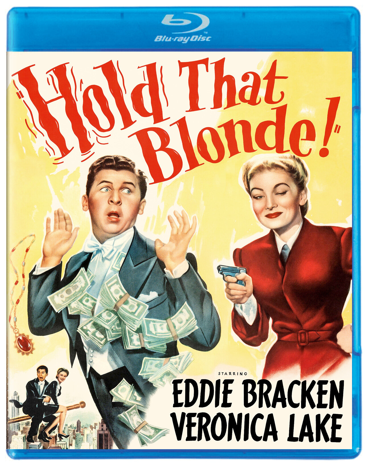Watch your wallet! Hold on to your girl! It’s the classic comedy Hold That Blonde! The hilarious Eddie Bracken (Hail the Conquering Hero, The Miracle of Morgan’s Creek) stars as Ogden Spencer Trulow III, a wealthy kleptomaniac who turned to stealing when he was spurned by a girl. His psychoanalyst advises him to find another girl for a cure. So he fastens his interest upon Sally Martin, played by the incomparable Veronica Lake (Sullivan’s Travels, The Hour Before the Dawn), who happens to be engaged upon helping some crooks steal a valuable necklace. Complications include two scantily attired individuals, one of them drunk, clinging to the cornice of a skyscraper and a large band of thieves in pursuit of the precious jewels. This splendid comedy caper was helmed by George Marshall, director of Hollywood gems like The Ghost Breakers, Murder, He Says and The Blue Dahlia.
