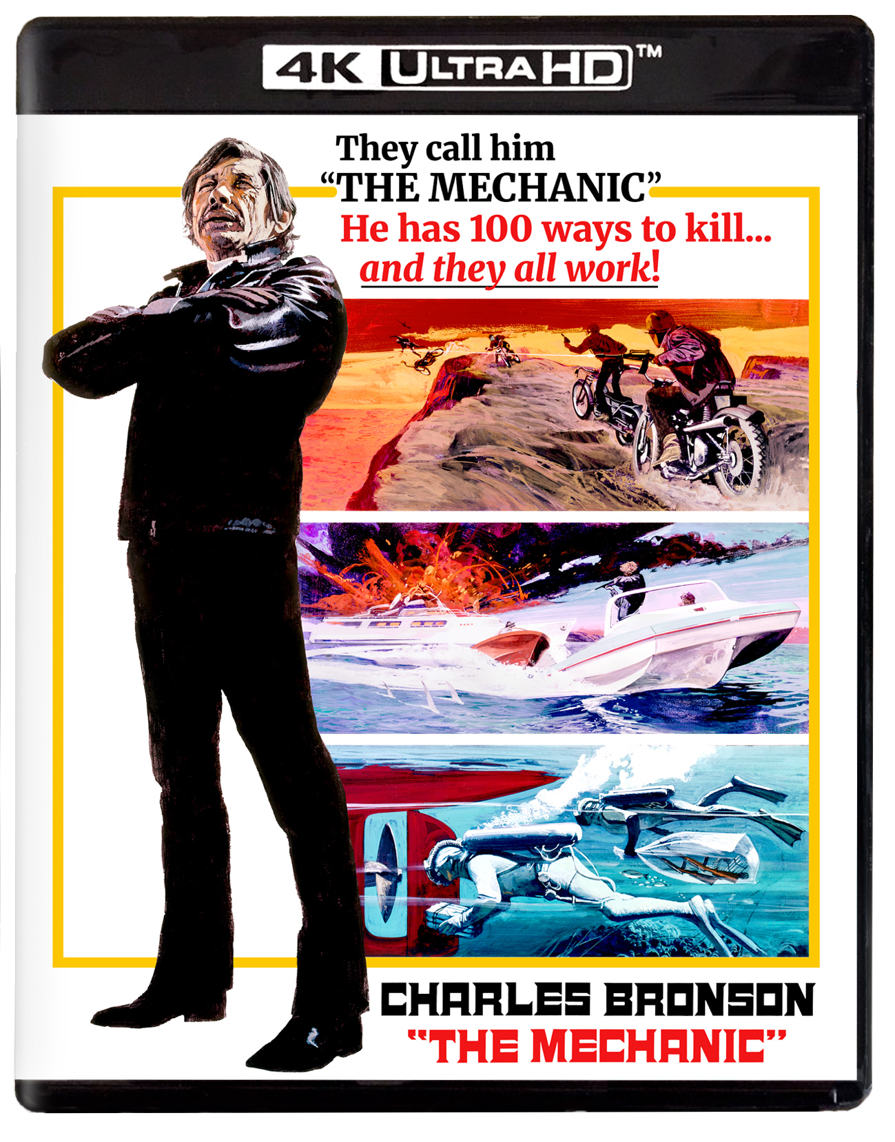 He has 100 ways to kill...and they all work! The iconic Charles Bronson (Death Wish I-V, 10 to Midnight) is at his no-nonsense best as the star of this action-drenched tale of an expert hired killer. Dignified, wealthy Arthur Bishop (Bronson) is a “Mechanic”—a professional assassin who “fixes things” for the all-powerful Organization. A man of refined tastes, his methods of engineering death are limited only by his boundless imagination. His specialty is doing every job differently, and always making his kill look like an accident. Bronson is perfect as the consummate hit-man, with his rugged, brooding self-assurance; Jan-Michael Vincent (Defiance), Keenan Wynn (Orca) and Jill Ireland (Breakheart Pass) are his marvelous co-stars. Writer Lewis John Carlino (Seconds) and director Michael Winner (Bronson gems Chato’s Land, The Stone Killer and Death Wish 1-3) pack the screen with hard-edged action, hair-raising chase sequences, exotic locales and shocking plot twists—making The Mechanic the ultimate ’70s crime thriller.