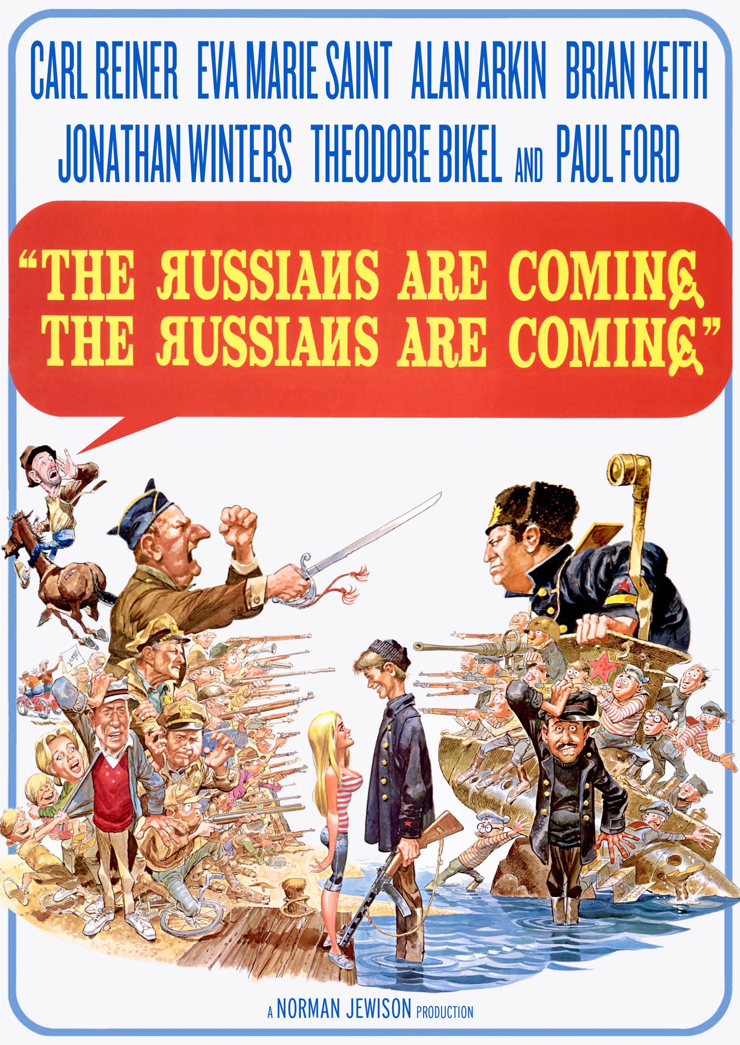 When sightseeing Soviet commander (Alan Arkin, The In-Laws) runs his submarine aground off the New England coast, his crew tries to find a boat to dislodge the sub almost starts World War III. Arkin leads and all-star cast that includes Carl Reiner, Eva Marie Saint, Brian Keith and Jonathan Winters - in this riotous, uproarious and sidesplitting comedy. Russian Lt. Rozanov (Arkin) and his crew hit the beaches of Massachusetts unaware of the panic they're about to start. Despite the Russians' harmless intentions, the folks in town think a full-scale Soviet invasion has been launched! What's worse, their police chief (Keith) has left his hysterical assistant (Winters) in charge... and the one man who knows the truth (Reiner) is only stirring up more chaos! The great Norman Jewison (In the Heat of the Night) directs this wonderful comedy based on the Nathaniel Benchley novel with a screenplay by William Rose's a Mad, Mad, Mad, Mad World). The hilarious cast includes Paul Ford, Theodore Bikel and John Phillip Law. Nominated for 4 Academy Awards including Best Director (Norman Jewison), Best Actor (Alan Arkin), Best Adapted Screenplay, and Best Film Editing.